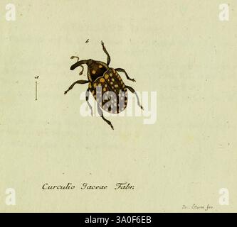 . Favnae insettorvm Germanicae initia, oder, Deutschlands Insecten . ^{cz/cicAiciJ /2c/citztus ^czlr? MÄLACHIVS fasciatus. Der RollibandirU Tf^arzenklfer. La cicindc-le ä handes rouges. Geoffr. Te»lephore ä maniche rouges. Degecr, JVIalachius fascciatus: Elytvis nigris, fascciis duabn« rufis. Fahric. Sist. Int. T. I. n. i3. Pag. 226. Sist. N. ENT 4. pag. 208. Spec. Ins T. I. n.5.p. 262. Mant. Ins T. I. n. 8. Pag. 169.Cantharis fascinata. Linn. Sist. N. NAT 10. Pag. 648- ed. XIII. N. 10. pag. 1899. Faun. Si.ec. N. 711.Cicindela elyiris nigiis , fasciis duabiis rufiS. Geoffr. Ins T. I. n. i2, pag. 177.Scop.