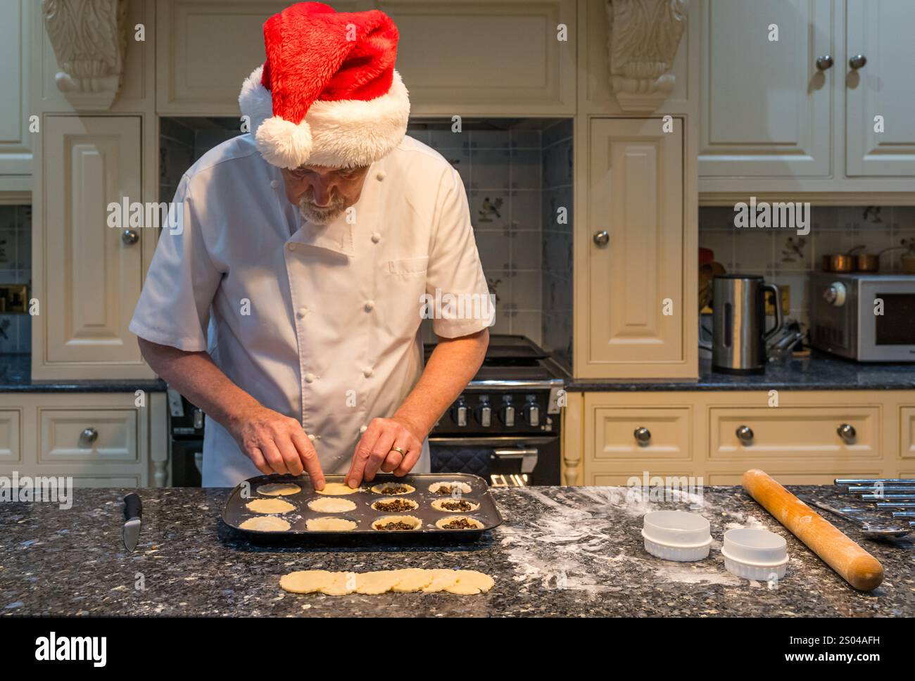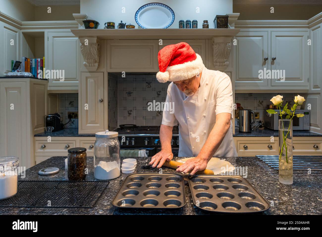 Un uomo anziano che indossa lo chef bianco e un cappello di Babbo Natale che prepara torte mince per dolci natalizi su un bancone della cucina, Regno Unito Foto Stockhttps://www.alamy.it/image-license-details/?v=1https://www.alamy.it/un-uomo-anziano-che-indossa-lo-chef-bianco-e-un-cappello-di-babbo-natale-che-prepara-torte-mince-per-dolci-natalizi-su-un-bancone-della-cucina-regno-unito-image636879747.html
