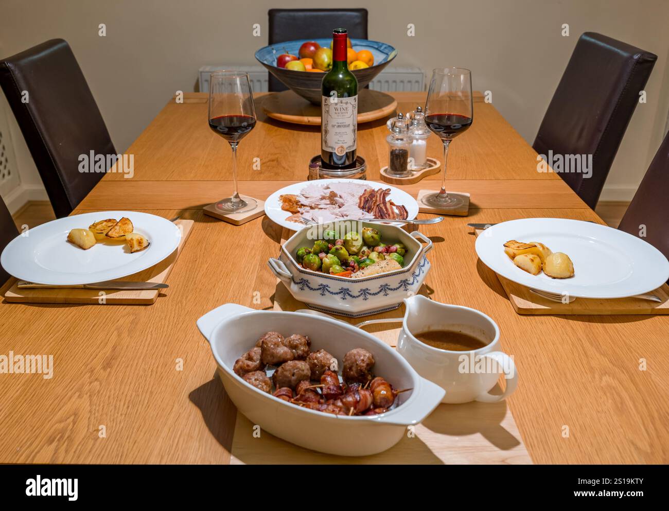 Tavolo da pranzo per la cena di Natale con tacchino cotto, verdure, maiali in coperte e sugo di carne, Regno Unito Foto Stockhttps://www.alamy.it/image-license-details/?v=1https://www.alamy.it/tavolo-da-pranzo-per-la-cena-di-natale-con-tacchino-cotto-verdure-maiali-in-coperte-e-sugo-di-carne-regno-unito-image637611435.html