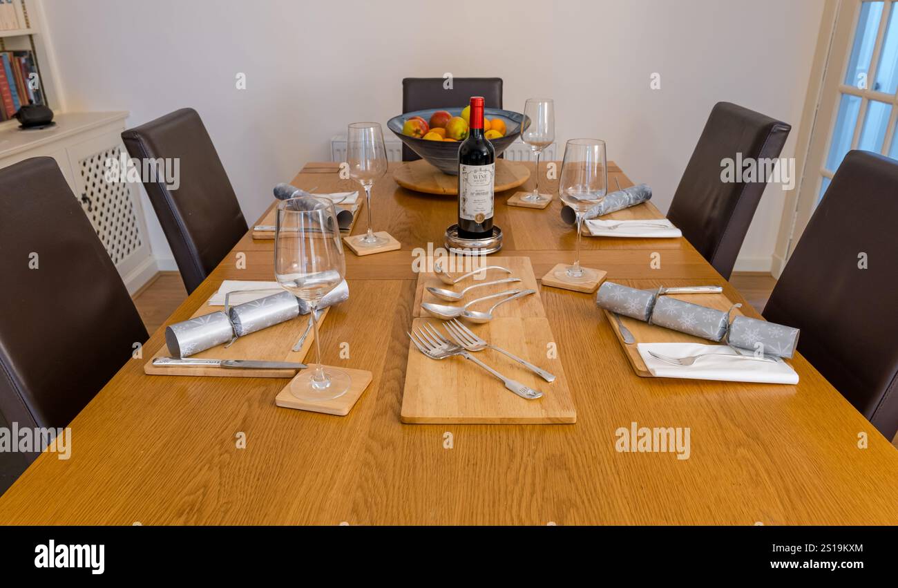 Tavolo da pranzo per la cena di Natale con cracker di Natale, bottiglia di vino raffinato e bicchieri da vino, Regno Unito Foto Stockhttps://www.alamy.it/image-license-details/?v=1https://www.alamy.it/tavolo-da-pranzo-per-la-cena-di-natale-con-cracker-di-natale-bottiglia-di-vino-raffinato-e-bicchieri-da-vino-regno-unito-image637611484.html