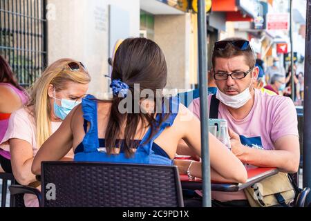 RF2C5N713–Punta Umbria, Huelva, Spagna - 3 giugno 2020: Le persone che si trovano sulla terrazza di un bar e di un bar, indossano una maschera protettiva a causa del covid-19. Huelva, Spagna
